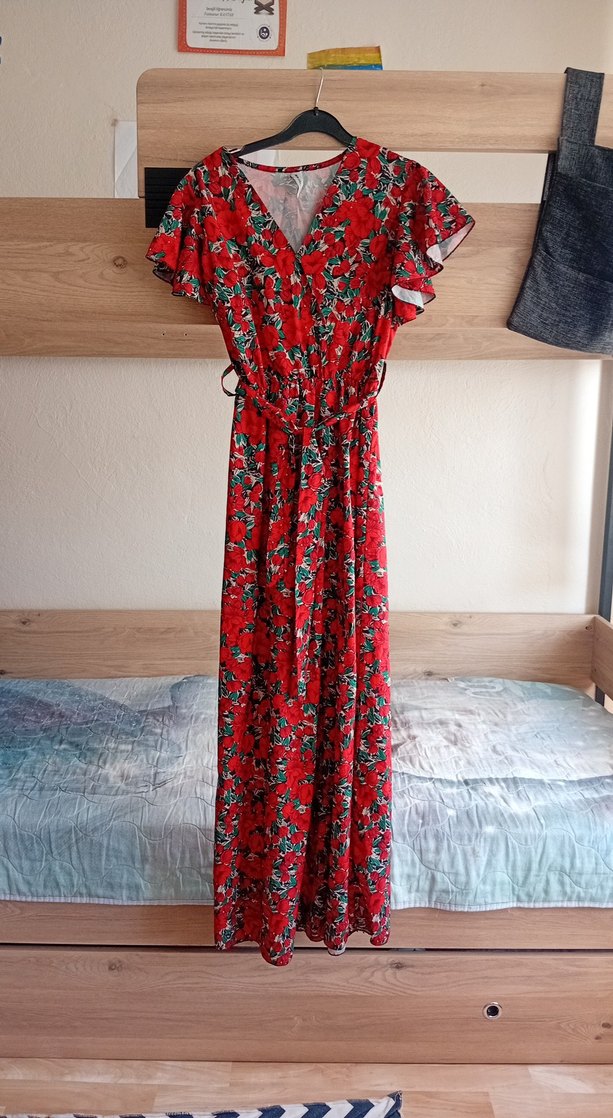Renkli kırmızı uzun elbise, bol kesim, drapeli kumaş, askılı kollar ve V yakaya sahip, romantik akşamlar için uygundur.