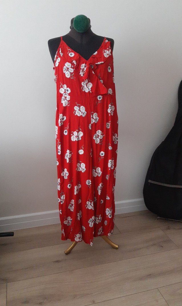 Kırmızı, viskon yazlik tulum. V yaka, askılı ve renkli çiçek desenli, yumuşak viskon kumaştan yapılmıştır.