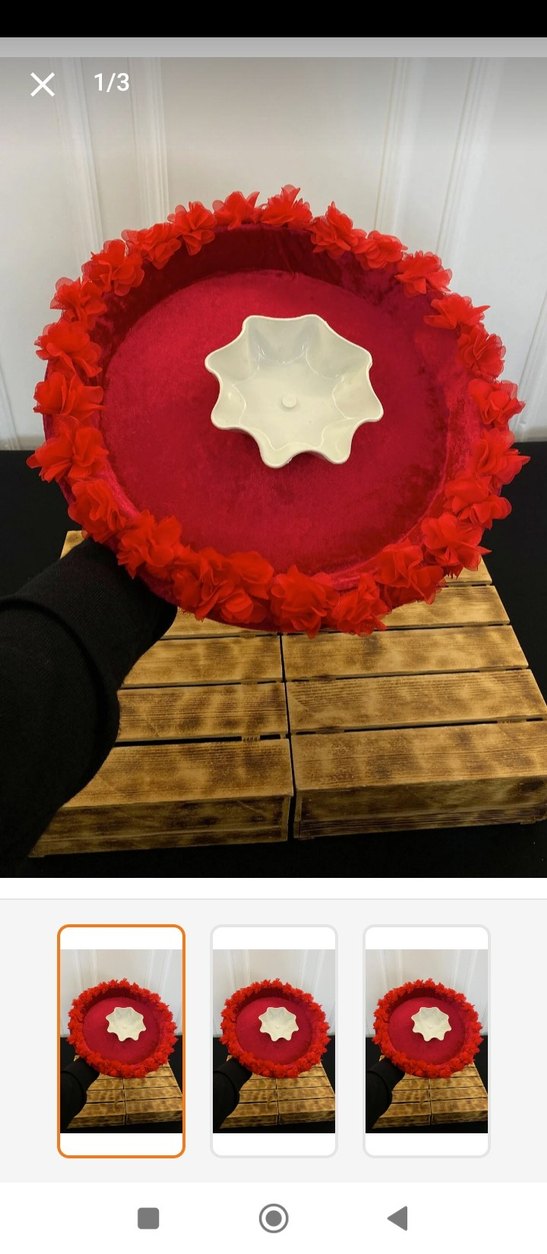 Kenarları kumaş çiçeklerle süslü parlak kırmızı dekoratif tepsi, ortasında dalgalı tasarımlı beyaz seramik kase bulunur.