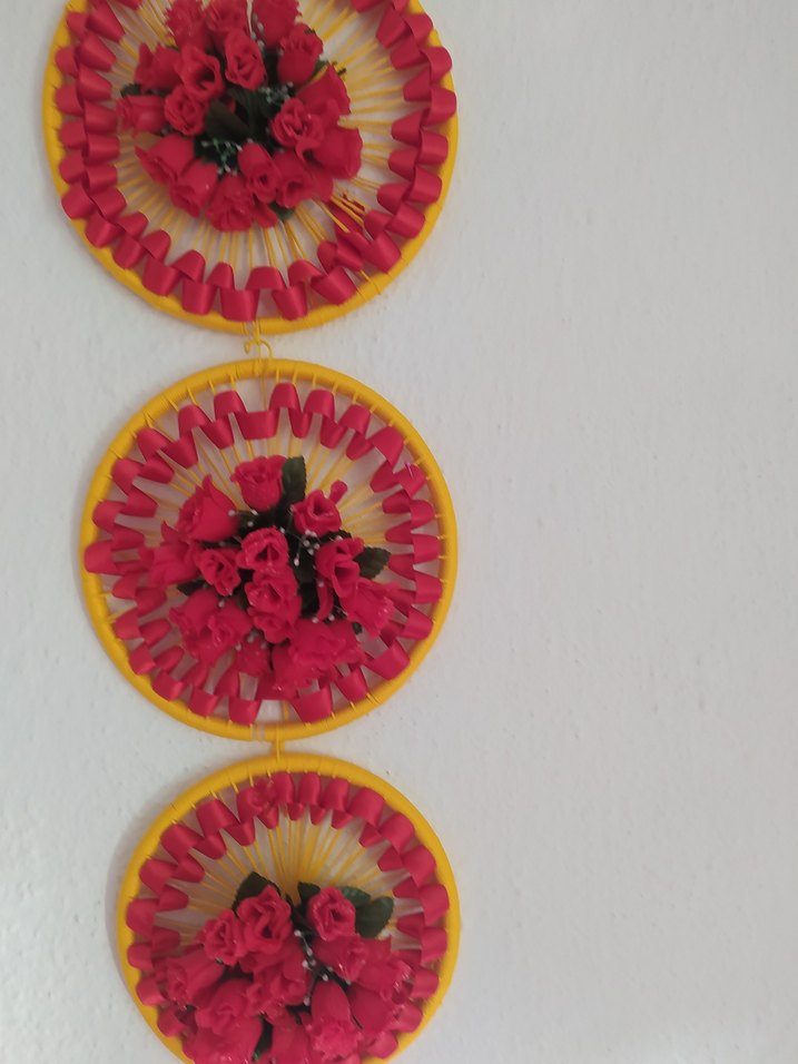Sarı kenarlı üç dairesel çerçevede kırmızı kumaş çiçeklerin bulunduğu renkli duvar dekoru.