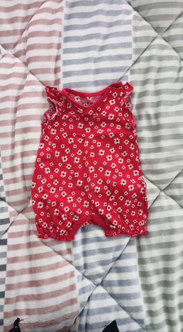 Küçük beyaz çiçek desenli, kırmızı renkli, yumuşak kumaştan yapılmış ve fırfırlı kollara sahip renkli bebek tulumu. 1/ 3 ay