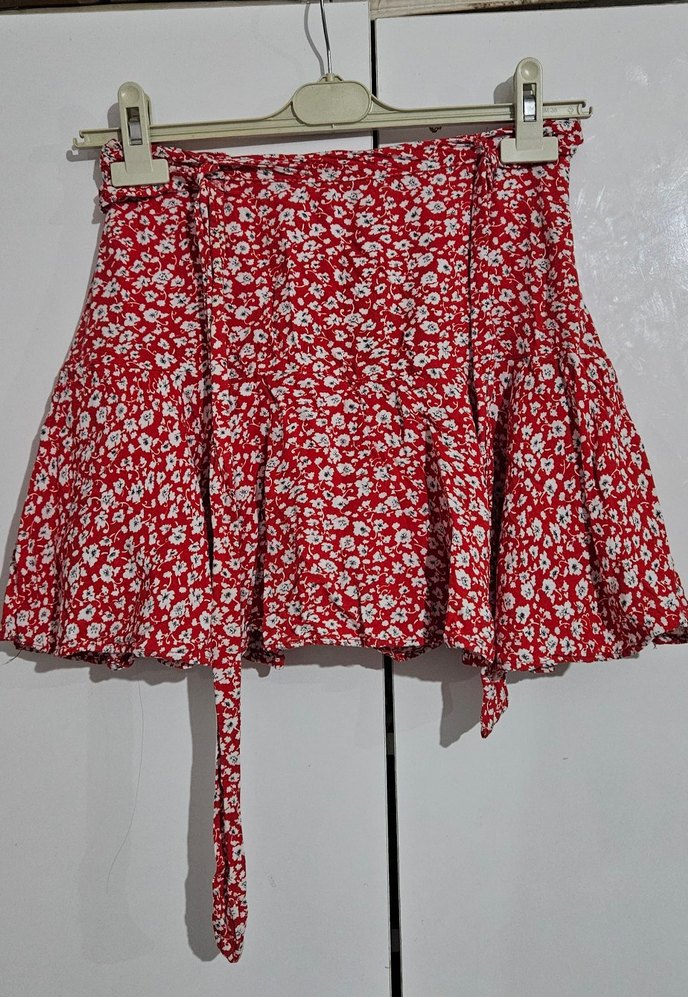 Sentetik kumaştan, hafif kırmızı çiçek desenli, fırfırlı ve bol kesim mini etek. Bohem tarz ve açık hava için uygundur. Xs-S bedene uygun,ölçüleri görsellerde.Tertemiz.