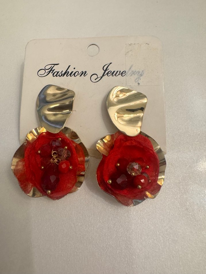 Kırmızı Çiçekli gold detaylı Küpe