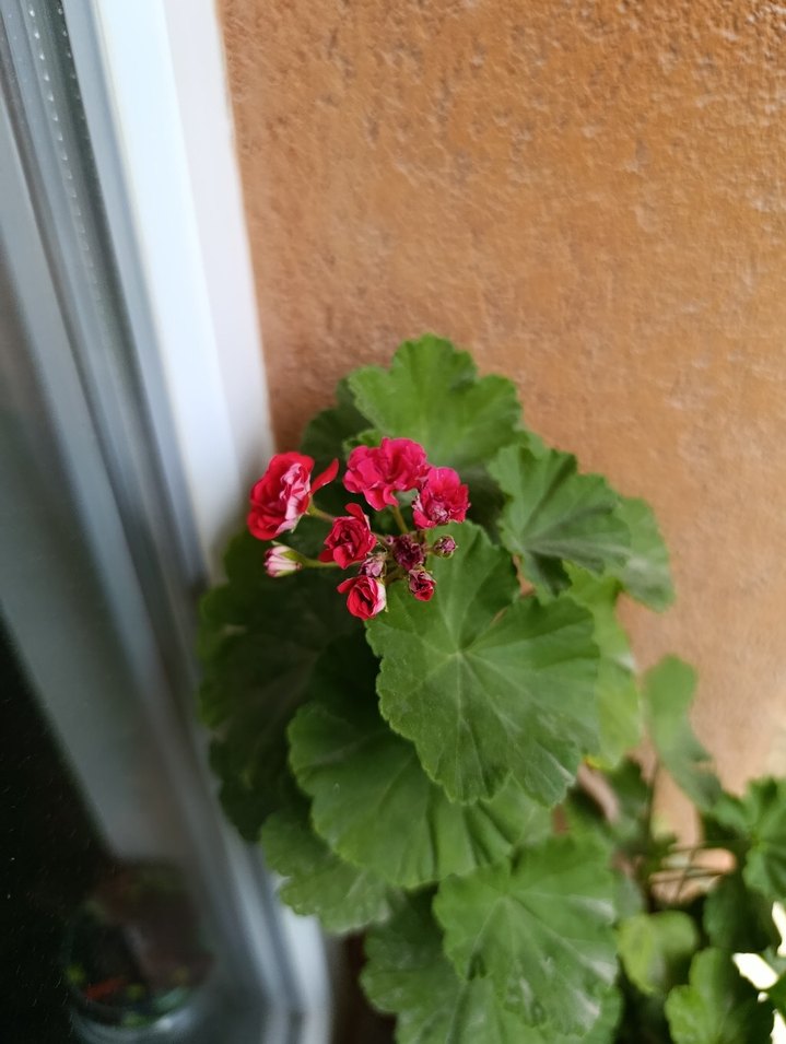Geniş yeşil yaprakları ve canlı kırmızı çiçekleri olan saksı bitkisi.
