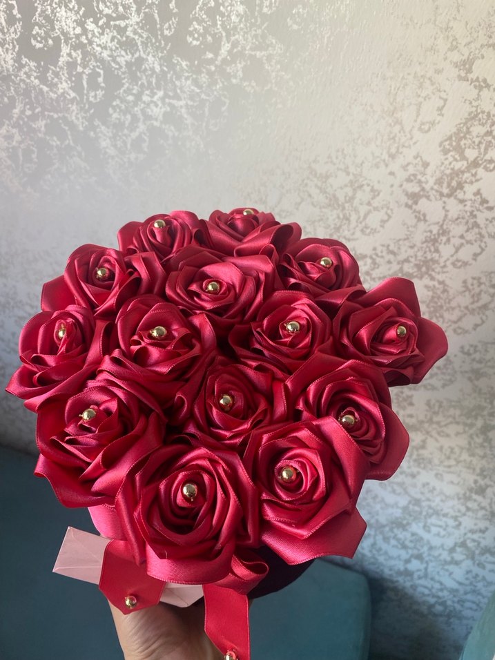 Canlı kırmızı kurdele güller ve altın boncuk detaylı, çiçek desenli, cesur ve çağdaş tarzda kadın broşu.