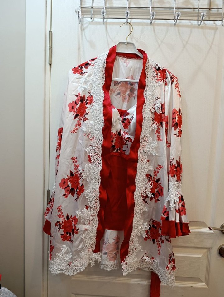 Uzun kollu, kırmızı çiçek desenli, beyaz dantel detaylı, Paris tarzı klasik kesim midi sabahlık.