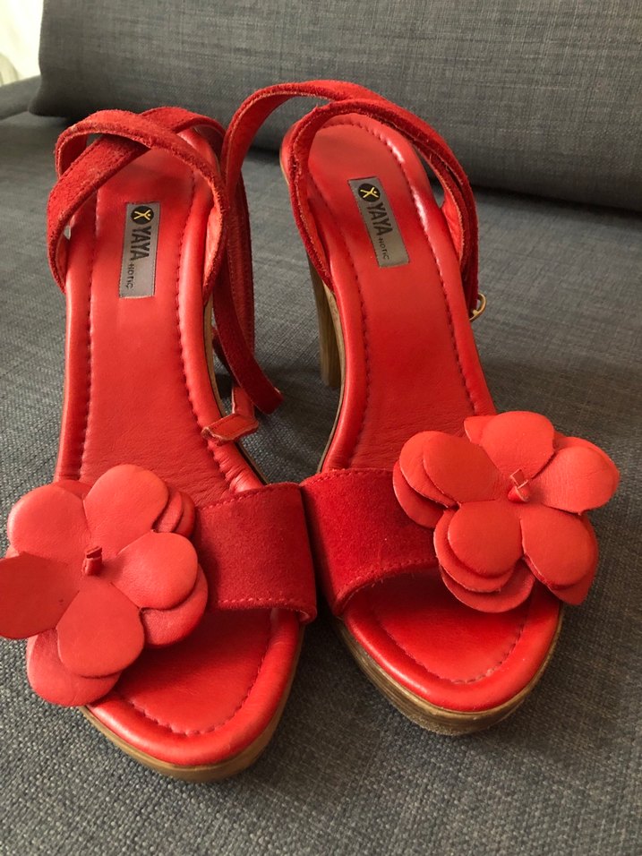 YAYA markalı, tokalı kayışlı ve çiçek detaylı kırmızı platform topuklu sandalet, romantik akşamlar için ideal kendi orjinal kutusunda .