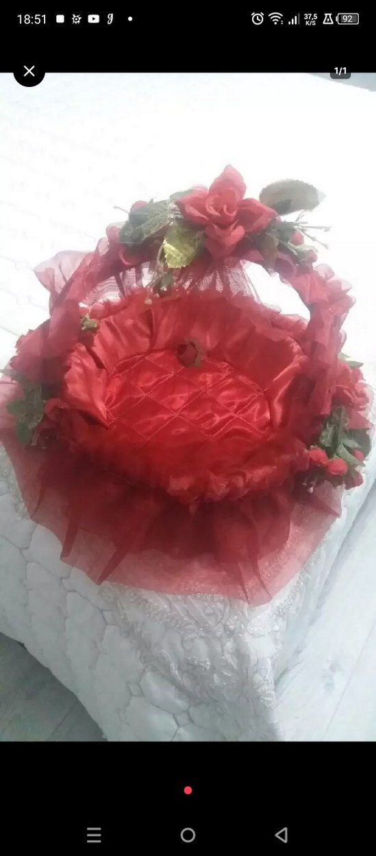 Kırmızı kumaş çiçekler ve yapraklarla süslenmiş, yumuşak dolgulu iç kısmı ve kumaş kaplı sapı olan canlı renkli sepet.