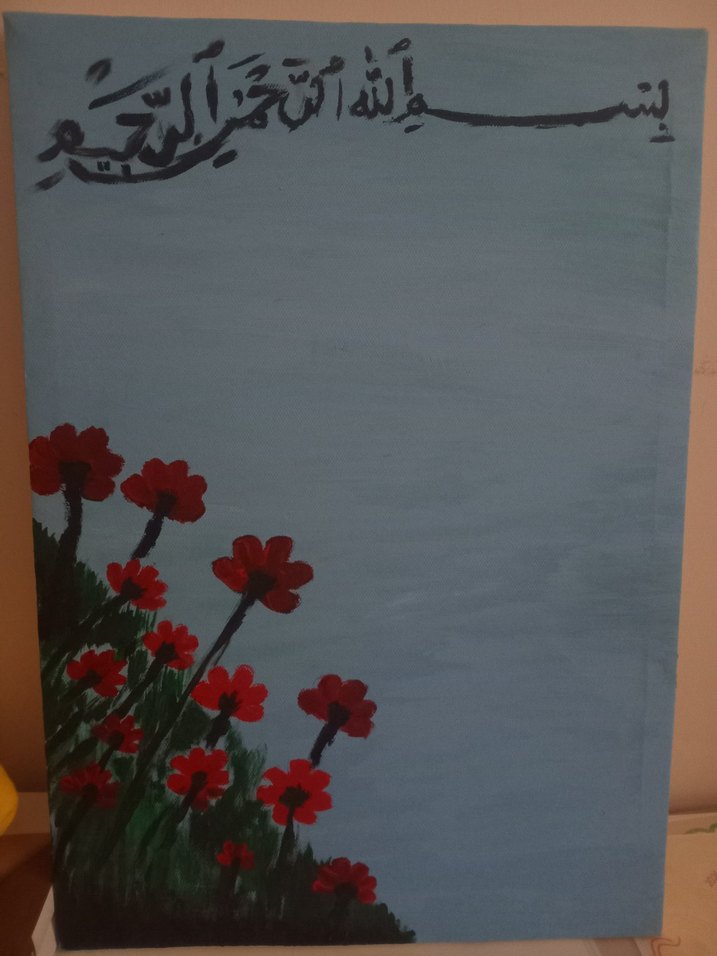 Açık mavi zeminde üstte Arapça hat yazısı, altta sol köşede koyu kırmızı çiçekler bulunan tablo. Seneler önce yapılmış, tamamlanmamış bir tuval ihtiyaçtan ötürü satmak istedim