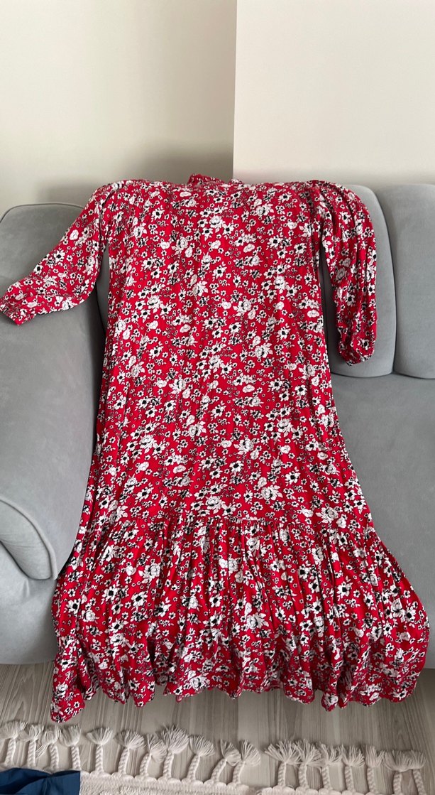 Uzun, kırmızı çiçekli, tekne yaka ve uzun kollu. Bol kesim ve drapeli detaylarla bohem tarzını yansıtıyor. s-m beden