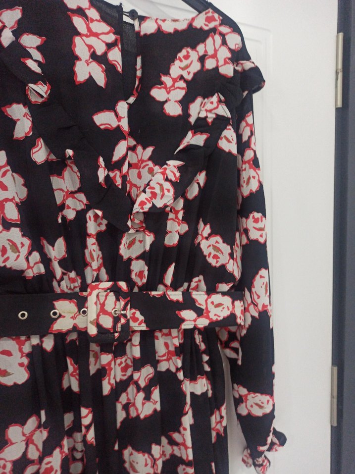 Sentetik kumaştan, uzun ve bol kesim kadın elbise. Koyu renkli çiçek deseni, fırfır detaylar ve V yakaya sahip. Askılı kolları ve kemeriyle Paris sokak modasına uygun.