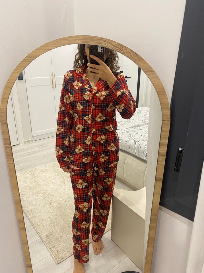 Koyu kırmızı ayıcık desenli, uzun kollu, midi boy, bol kesim kadın pijama takımı, rahat sokak stili için uygundur.