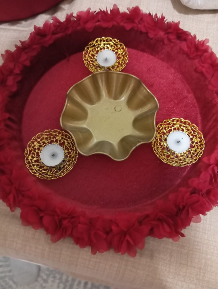 Kırmızı çiçeklerle süslenmiş tepsi, altın renkli orta parça ve beyaz mumlu üç dekoratif mumluktan oluşur. ️