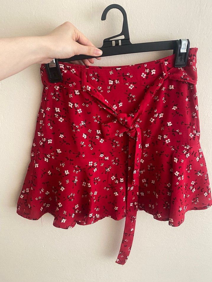 Koyu kırmızı çiçek desenli, belden bağlamalı ve volan detaylı, rahat kesim sentetik kumaştan mini etek.