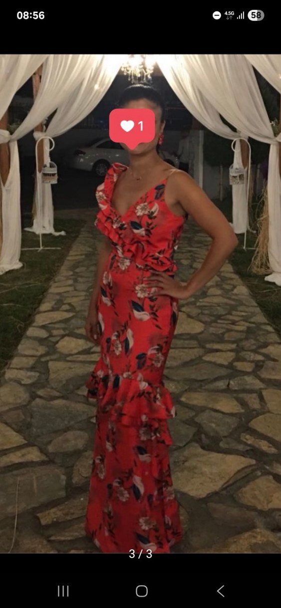 Kırmızı Çiçekli Volanlı Uzun Elbise