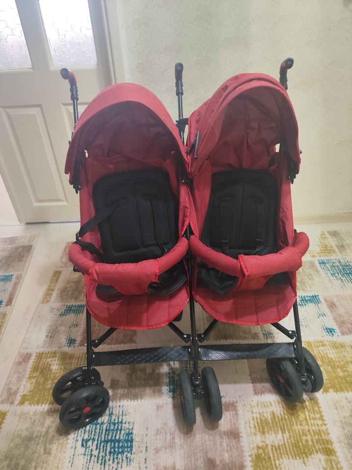 Koyu kırmızı renkli çift bebek arabası, güvenlik kemerli iki ayrı oturma alanı ve koruyucu tentelerle birlikte gelir. ürün sıfırdir 1 defa kullanılmıştır