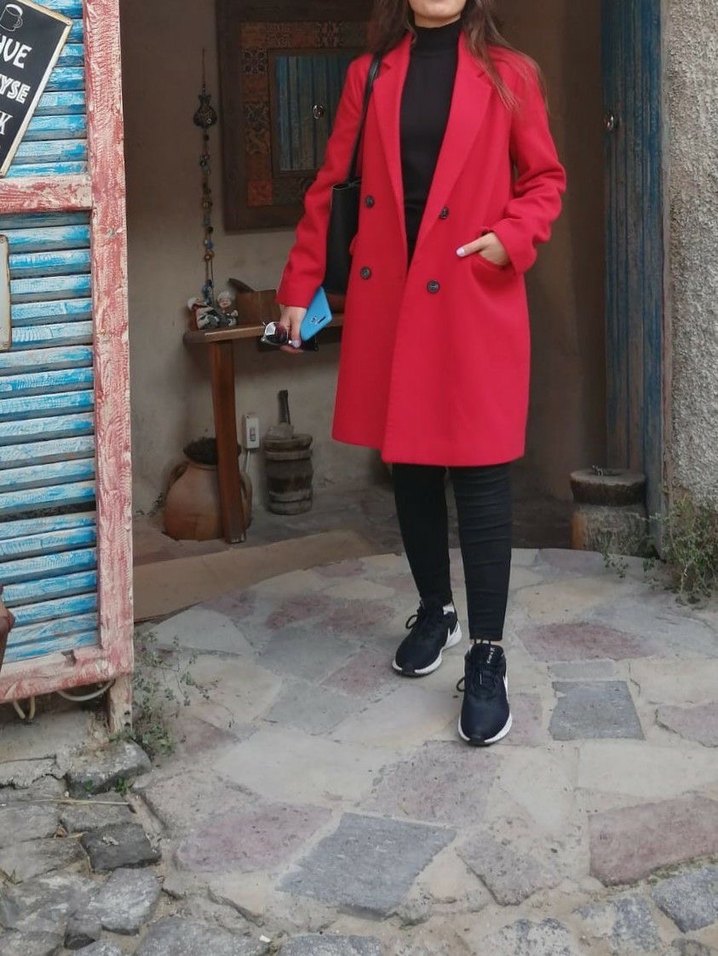 Kırmızı, çift düğmeli, siyah düğmeli ve yan cepli kaban. Yumuşak ve sıcak kumaştan, klasik yaka model. Serin havalar için uygun. Şu an kotonda 4500 yeni sezon ürünü