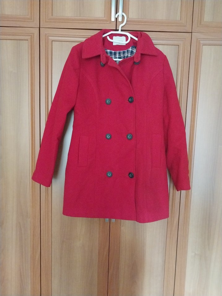 Kırmızı kaban, çift düğmeli tasarım ve yan ceplerle birlikte ekose iç astar detayına sahiptir. ışıktan dolayı rengi açık çıkmış ama koyu renk. kaşe kaban dar kesim .