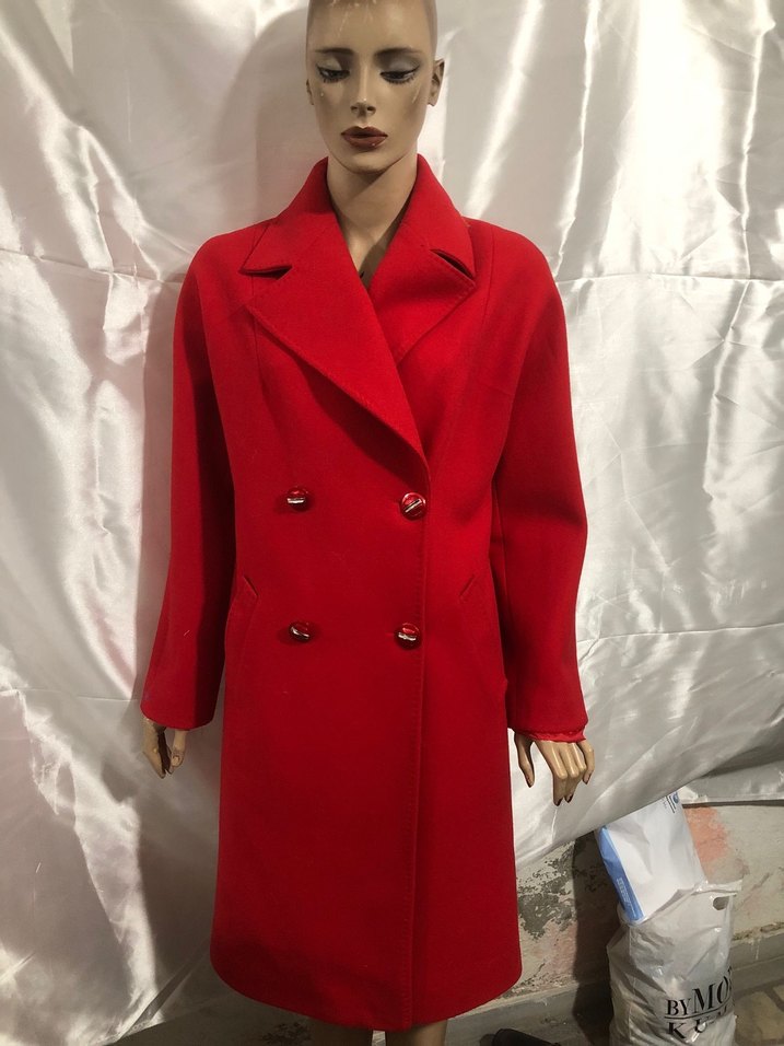 Kırmızı renkli, geniş yakalı ve çift düğmeli uzun kollu klasik kaban. . ihraç fazlası ürün sıfır etiketli, marka temsili