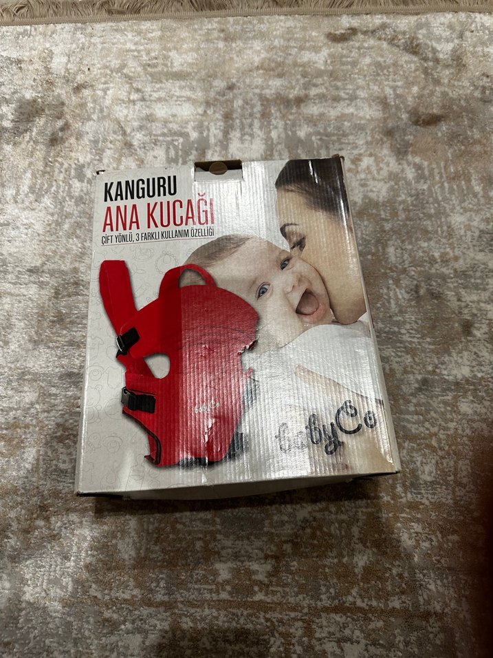 Koyu kırmızı renkte, çift yönlü kullanım ve eller serbest kullanım özelliği sunan bebek kangurusu.
