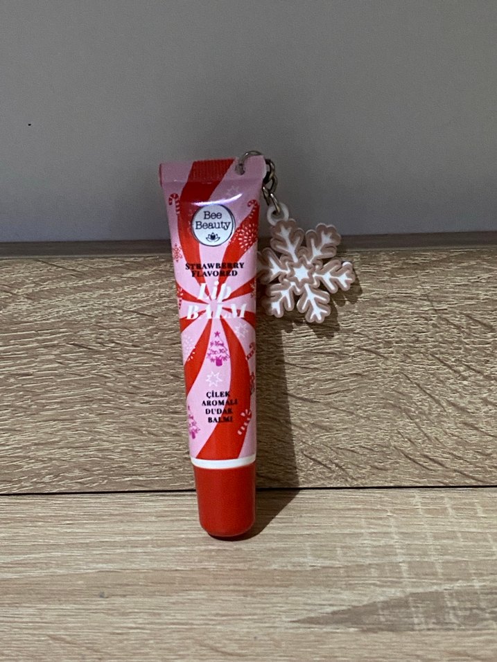 Çilek aromalı kırmızı dudak parlatıcısı, renkli parlaklık ve kar tanesi süsü ile.