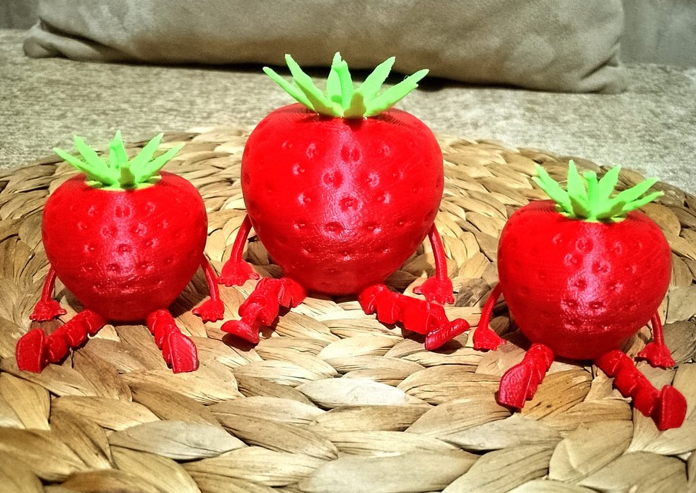 Küçük kolları ve bacakları olan, yeşil yapraklı renkli kırmızı çilek figürin.