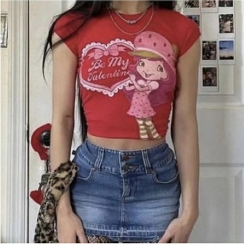 kırmızı çilek kız baskılı vintage crop
