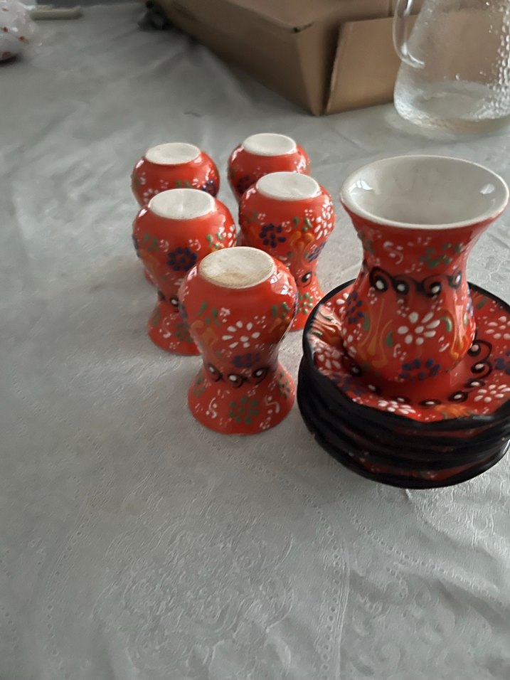 Kırmızı renkte, çini desenli Türk kahvesi fincanı ve tabak seti