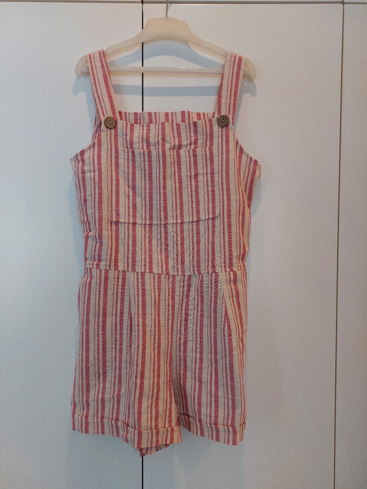 pastel kırmızı çizgili, düğmeli askılı, bol kesim bohem tarzı tulum. 36 cm bel 63 cm boy