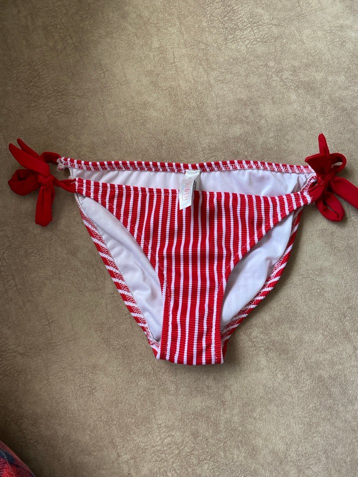 Renkli kırmızı çizgiler ve yanlarda bağcıklı, plaj için uygun, vücuda oturan kadın bikini altı.