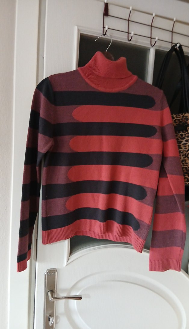 Yumuşak yünden, balıkçı yaka ve uzun kollu, çizgili desende, koyu kırmızı tonlarında, günlük kullanıma uygun rahat ve modern kesim kadın kazak. çok az giyildi