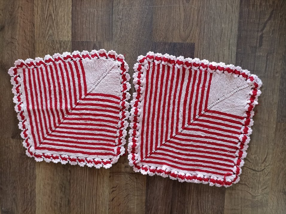 Kırmızı ve beyaz çizgili, süslü kenarlı renkli banyo süngerleri seti.