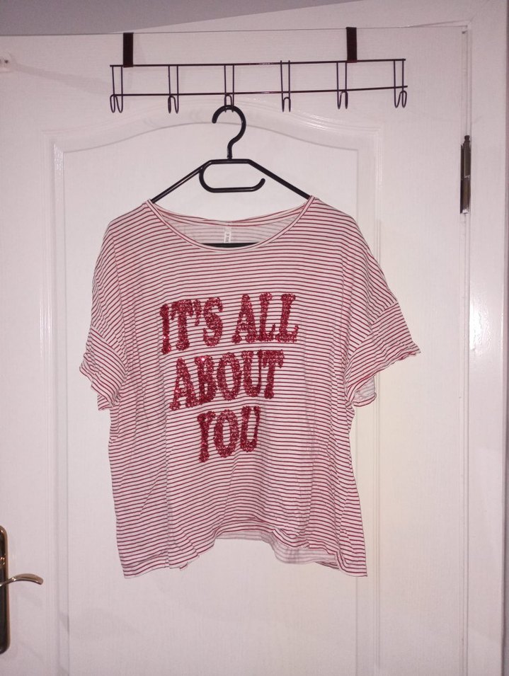 Kısa kollu, bol kesim pamuk tişört, kırmızı çizgili ve önünde 'IT'S ALL ABOUT YOU' baskısı bulunur. Yuvarlak yaka, günlük sokak tarzı için uygun. Hiçbir defosu yoktur, ihtiyacı olan birini alması için koyuyorum