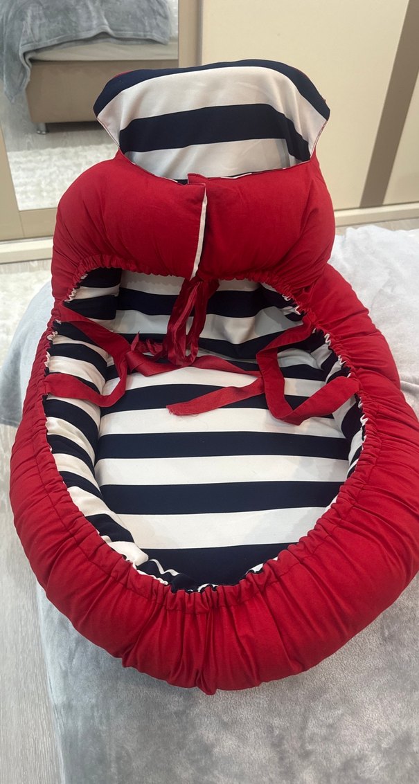 Renkli çizgili iç kısmı ve kırmızı dış yüzeyi olan bebek uyku yatağı, yumuşak sentetik kumaştan üretilmiştir. Ayarlanabilir bağcıklarıyla rahat uyku sağlar. ️