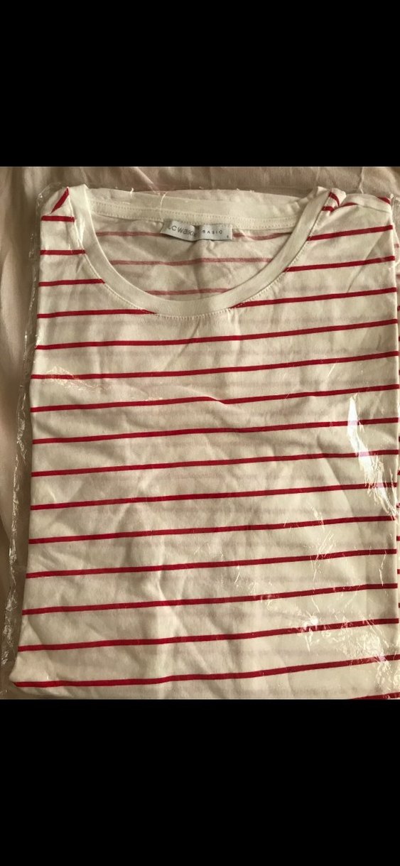 Pamuklu kumaştan, kısa kollu ve yuvarlak yakalı, kırmızı çizgili beyaz kadın tişörtü. Rahat kesimiyle günlük kullanıma uygundur.