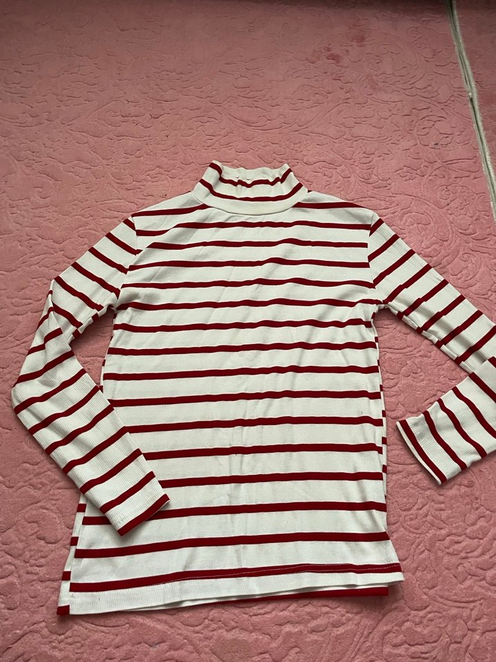 Uzun kollu, boğazlı ve ince kesim triko. Kırmızı çizgili deseni ve pamuklu, örme kumaşıyla rahat ve şık bir sokak stili sunar.