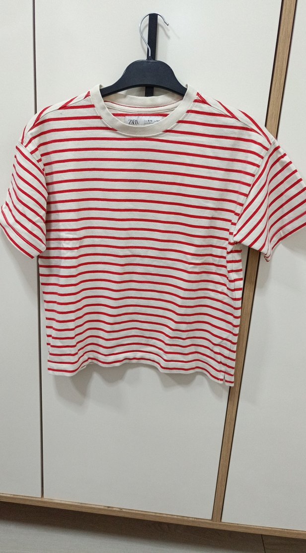 çocuk tişörtü, yuvarlak yaka ve kısa kollu, bol kesimdir. Beyaz üzerine açık kırmızı çizgili, yapılmıştır. Günlük rahat sokak stili için uygundur.