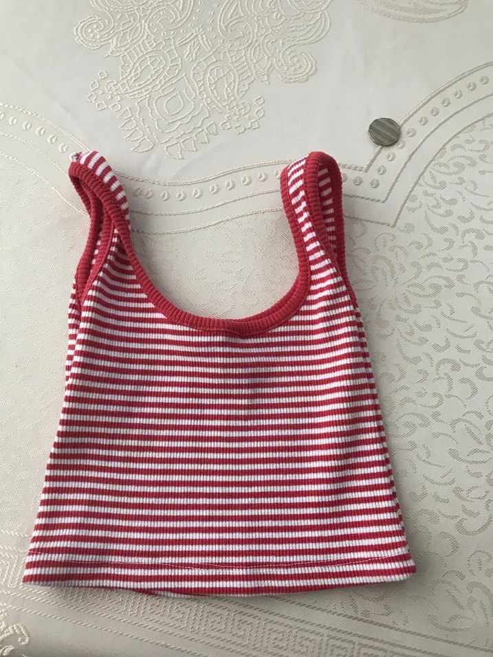 İnce kırmızı ve beyaz çizgilerle süslenmiş, crop. Rahat kullanım için yumuşak kumaştan üretilmiştir.