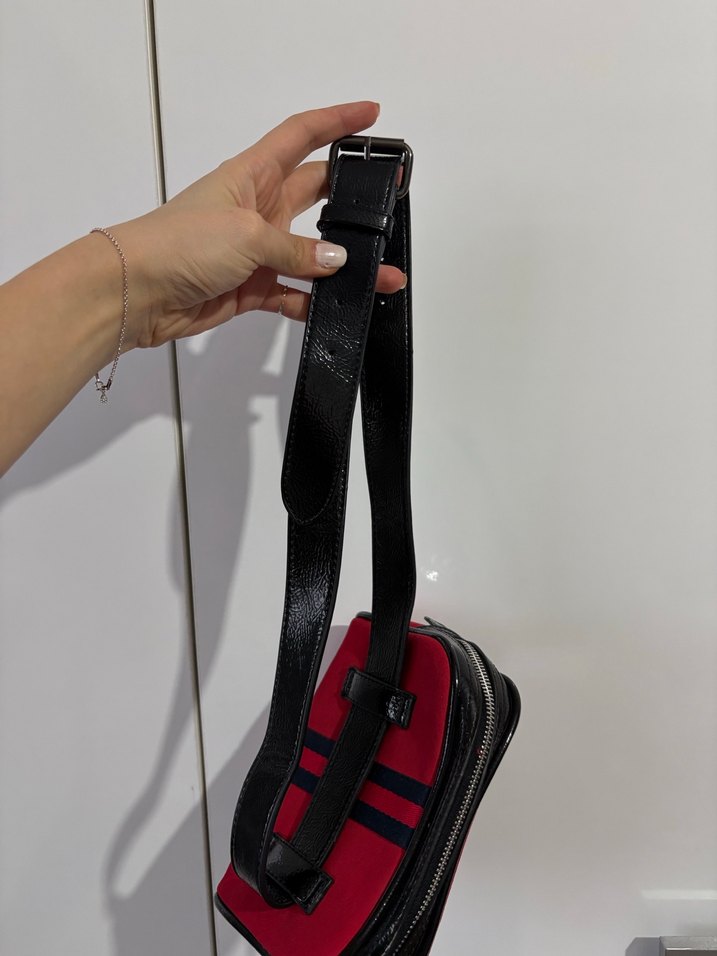 Kırmızı deri malzemeden yapılmış, çizgili ve kemerli tasarıma sahip kadın bel çantasıdır. Spor ve sokak modasına uygun şık bir parçadır.