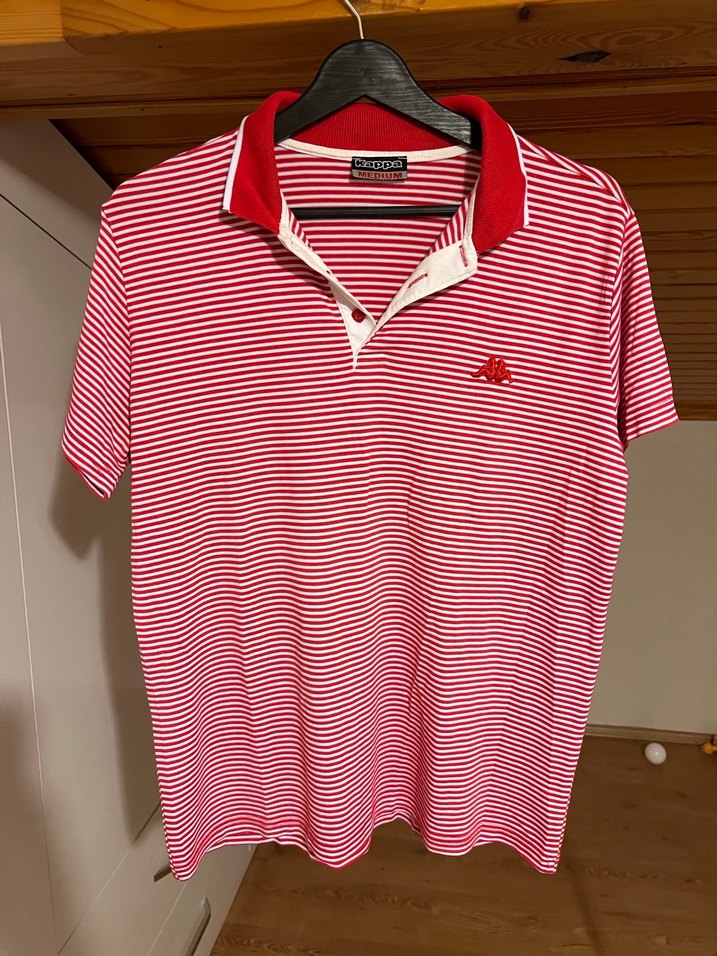 Renkli kırmızı çizgili, düğmeli erkek polo tişört. Pamuklu, kısa kollu ve bol kesim rahat sokak tarzı için uygundur. Günlük kullanıma ideal.