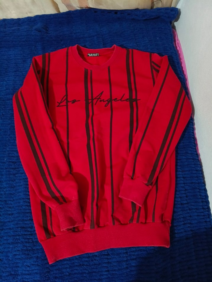 Kırmızı ve siyah çizgili, Los Angeles baskılı, uzun kollu, yuvarlak yaka, bol kesim erkek sweatshirt. Sentetik kumaştan örülmüş, renkli ve rahat sokak stili için uygundur. hiç kullanılmadı
