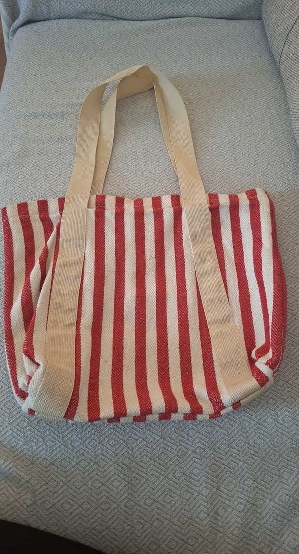 Sentetik kumaştan üretilmiş, kırmızı çizgili ve fermuarlı plaj çantası. Geniş bej askılarıyla bohem tarzına uygun, günlük kullanıma elverişli.