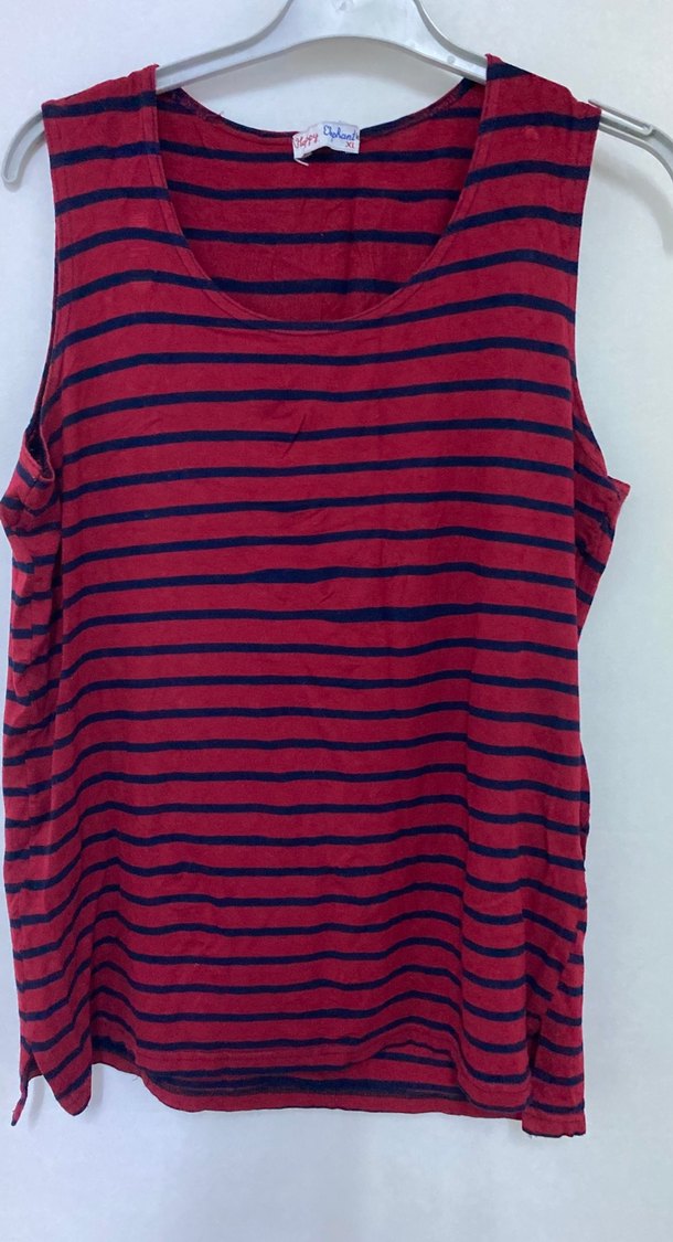 Kırmızı ve koyu çizgili, kolsuz hamile tişörtü. Yuvarlak yaka, bol ve dökümlü kesim, yumuşak keten kumaştan, günlük kullanıma uygun.