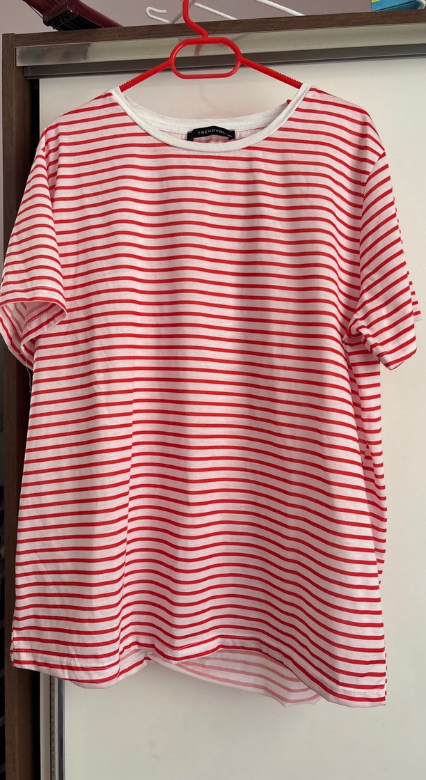 Hiç giyilmedi Kırmızı çizgili, pilili detaylı, pamuklu kumaştan bol kesim hamile tişörtü. Kısa kollu ve yuvarlak yakalı, rahat kullanıma uygun.