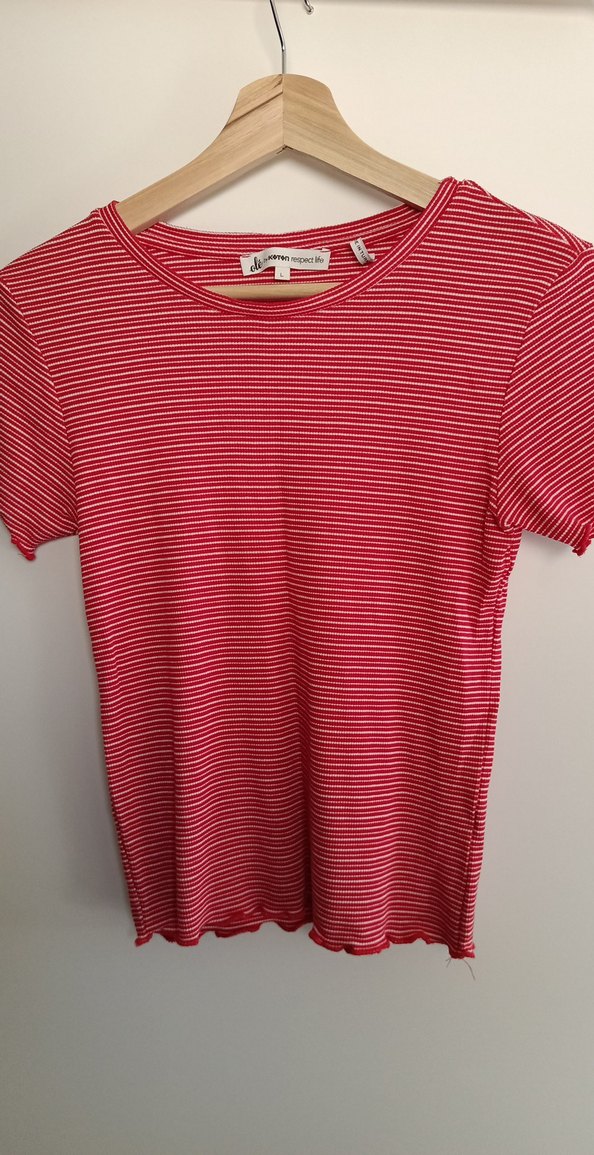 Kısa kollu, yuvarlak yaka, kırmızı çizgili, vücuda oturan kadın tişörtü.Yumuşak sentetik kumaştan, günlük rahatlık için uygundur.