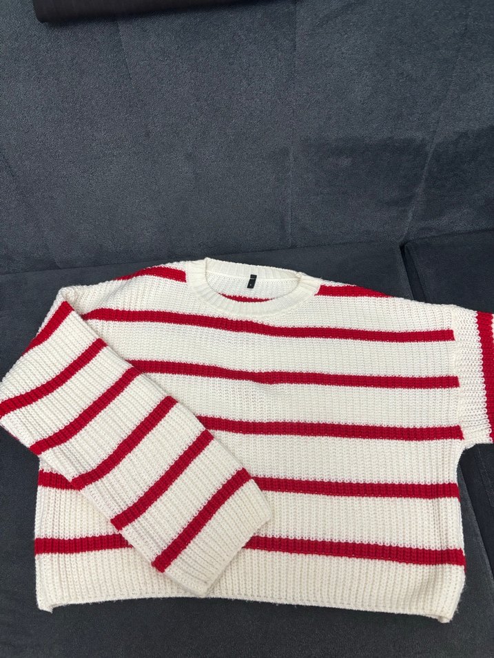 Uzun kollu, yuvarlak yaka kadın triko kazak. Kırmızı çizgili beyaz örgü kumaştan, bol kesim ve normal boydadır. Rahat sokak stili için uygundur. Trendyolmilla s bedendir.