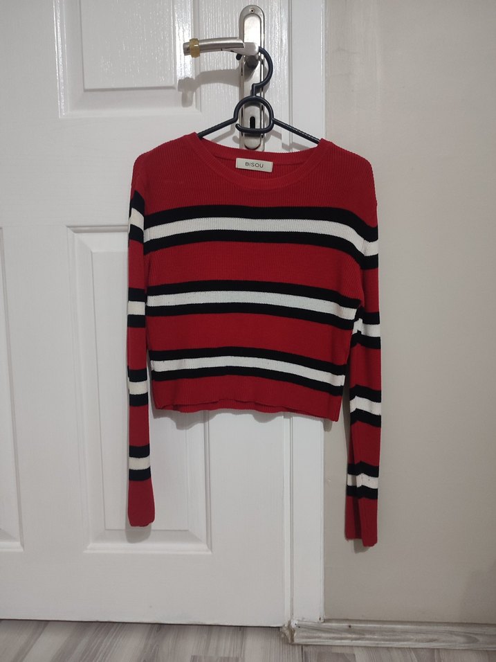 Uzun kollu ve yuvarlak yakalı, kırmızı ve siyah çizgili, ince triko kumaştan yapılmış, dar kesim kadın kazak.
