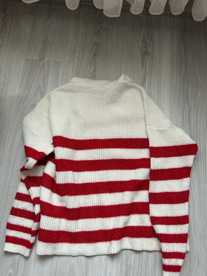Kadınlar için uzun kollu, yuvarlak yaka, gevşek kesim. Kırmızı ve beyaz çizgili örme triko, rahat ve günlük sokak stili sunar.