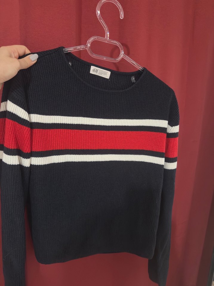 Uzun kollu, yuvarlak yaka, çizgili desende kırmızı ve beyaz şeritlere sahip kadın triko kazak. Günlük kullanıma uygun, rahat ve trend sokak stili sunar.