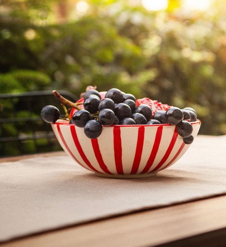 Seramik kaselerin ufak defoları olabilir kullanıma engel değildir. Kırmızı çizgili, bohem tarzda renkli kase. Meyve veya atıştırmalık sunumu için uygundur. 20cm çapında 7,5cm yüksekliğindedir.
